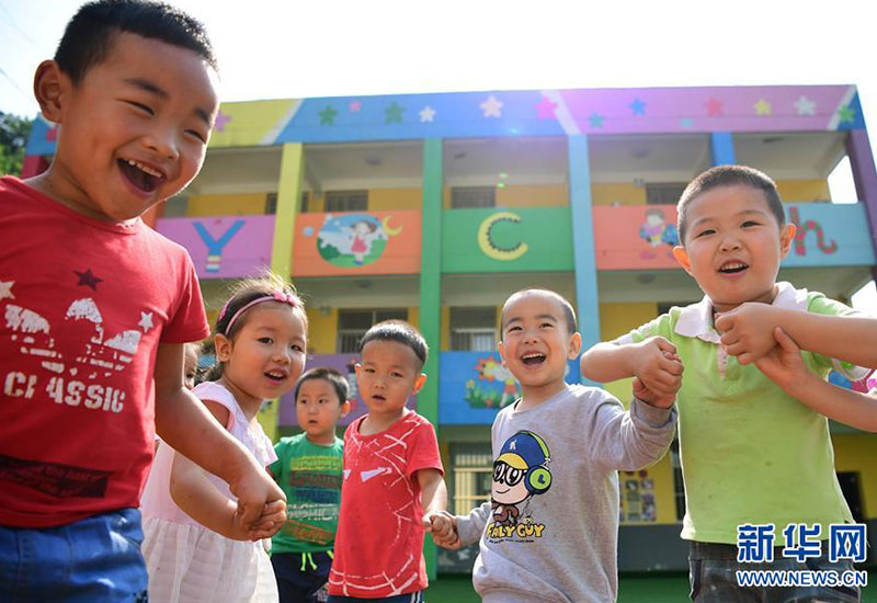 陜西省安康市漢濱區(qū)雙龍鎮(zhèn)杜壩村五四小學(xué)附設(shè)幼兒園小朋友們在操場上做游戲(2017年6月16日攝)。這個(gè)幼兒園使用貸款資金翻修改造而成,有效解決了該村及周邊兒童學(xué)前教育缺失的問題。新華社記者 邵瑞 攝
