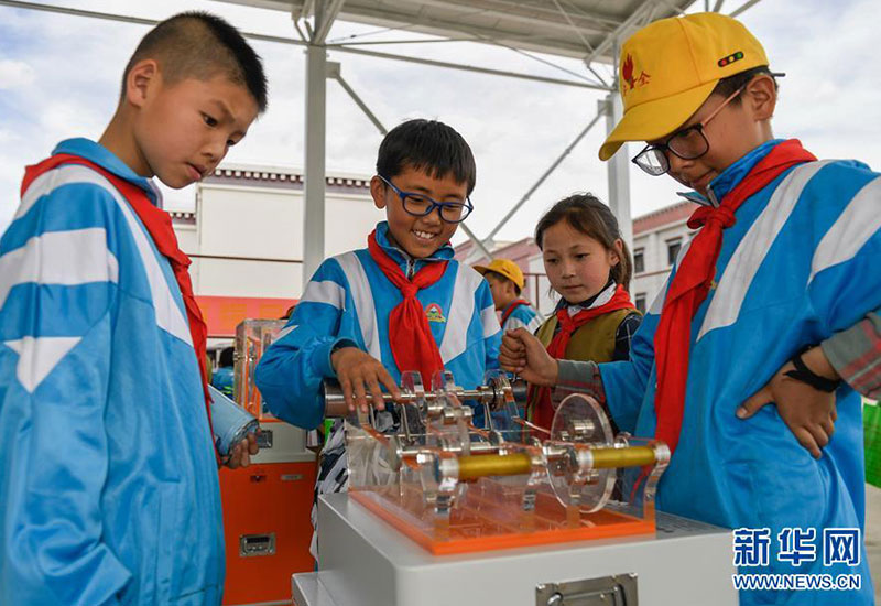 幾名學(xué)生在拉薩市流動(dòng)科技館巡展活動(dòng)現(xiàn)場體驗(yàn)科學(xué)小實(shí)驗(yàn)(5月24日攝)。 新華社記者 劉東君 攝