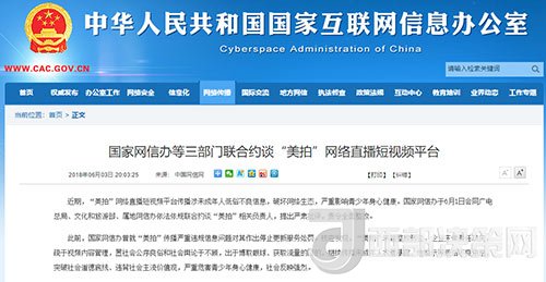 北京6月4日電據(jù)國家網(wǎng)信辦官網(wǎng)消息,近期,“美拍”網(wǎng)絡(luò)直播短視頻平臺(tái)傳播涉未成年人低俗不良信息,破壞網(wǎng)絡(luò)生態(tài),嚴(yán)重影響青少年身心健康。國家網(wǎng)信辦于6月1日會(huì)同廣電總局、文化和旅游部、屬地網(wǎng)信辦依法依規(guī)聯(lián)合約談“美拍”相關(guān)負(fù)責(zé)人,提出嚴(yán)肅批評(píng),責(zé)令全面整改。