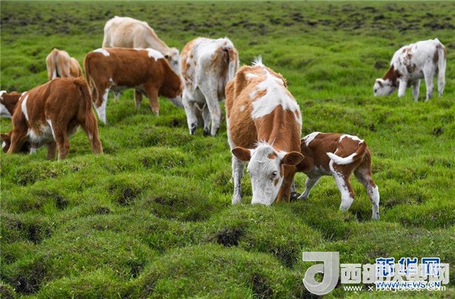 6月6日,牛群在內(nèi)蒙古赤峰市阿魯科爾沁草原上覓食。 新華社記者 彭源 攝