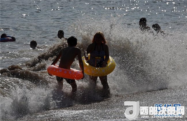 7月1日,游客在山東省青島市第一海水浴場(chǎng)戲水。 新華社發(fā)(黃杰顯 攝)