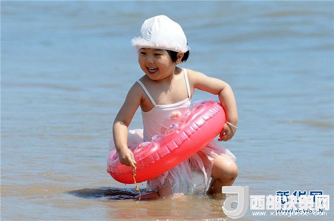 7月1日,一名小朋友在山東省青島市第一海水浴場(chǎng)戲水。 新華社發(fā)(王海濱 攝)