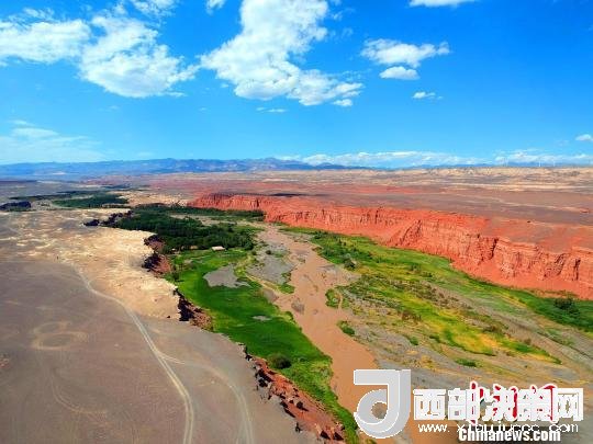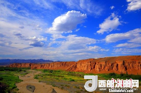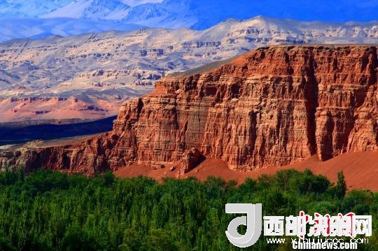 站在天山紅河谷入口處的斷崖邊,可以清晰地看到遠處的天山,天然的紅土飄帶,一簇簇的綠蔭,坐落有致的農家院落?;臎龅母瓯谂c斷崖下的美景,給人以強烈的視覺沖擊。紅色的山巖,猶如一條鑲嵌在天際間的飄帶而光彩奪目,河谷內寧靜的村莊透露著幾分神秘。
