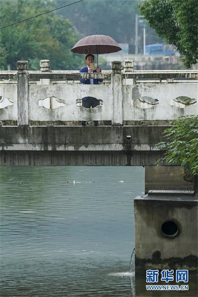 福建省福州市鼓臺中心區(qū)水系綜合治理點(diǎn)達(dá)道河河長溫水林在指揮工人進(jìn)行河道新建截污管的回填(2017年10月11日攝)。