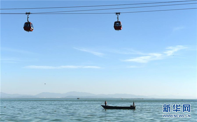 下方是工作人員在滇池上準(zhǔn)備打撈垃圾和雜物,上方是游客乘坐纜車在觀賞滇池景色(2017年11月14日攝)。云南省昆明市滇池流域自2008年以來實(shí)行河長制,河道生態(tài)環(huán)境和水質(zhì)得到明顯改善。