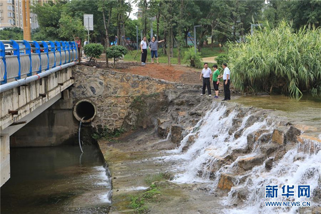 貴州省興義市桔山河的市級河長葛佳華(右二)與鎮(zhèn)級、村級河長對桔山河沿線一處排污管道進(jìn)行巡查(2018年7月15日攝)。
