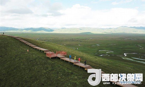 游客在瑪曲縣阿萬倉濕地的觀景步道上游覽(7月31日無人機(jī)拍攝)。新華社記者 陳斌 攝