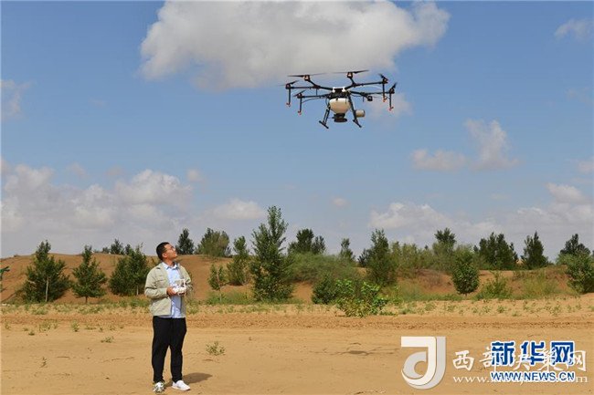 技術(shù)人員在內(nèi)蒙古鄂爾多斯市杭錦旗的庫(kù)布其沙漠里操控?zé)o人機(jī)飛播造林(7月11日攝)。 新華社記者 彭源 攝