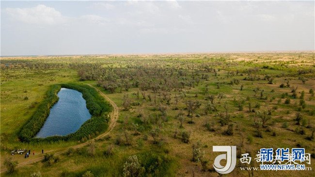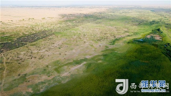 這是位于庫(kù)布其沙漠中的七星湖沙漠生態(tài)旅游區(qū)(7月11日無人機(jī)拍攝)。 新華社記者 彭源 攝