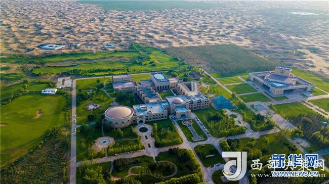 這是位于庫(kù)布其沙漠中的億利集團(tuán)阿木古龍甘草健康產(chǎn)業(yè)園(7月11日無人機(jī)拍攝)。 新華社記者 彭源 攝