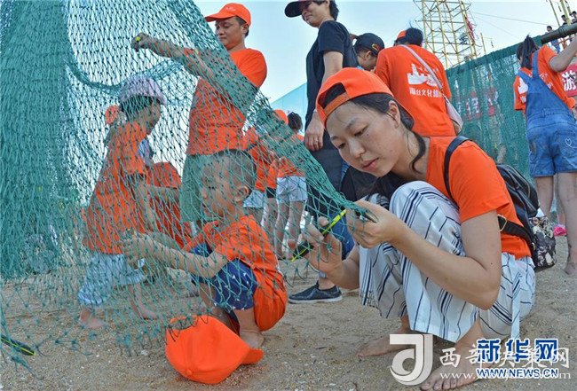 8月8日,“小候鳥”們與家長一起體驗漁網(wǎng)制作。