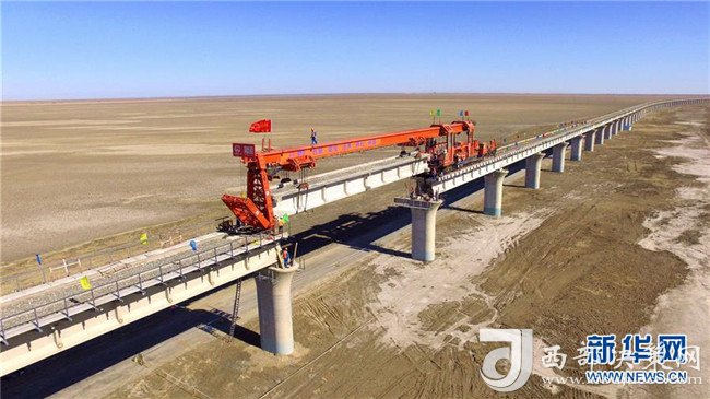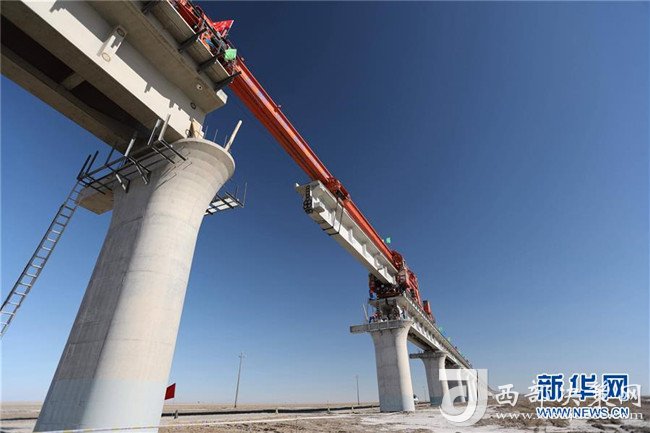 這是位于新疆若羌縣的臺特瑪湖特大橋施工現(xiàn)場(8月17日攝)。8月17日11時58分,在一組架橋機和運梁機的協(xié)調(diào)配合下,隨著最后一孔T型梁上的梁體精準吊裝到位,全長24.558公里、歷時2年建設的格庫鐵路(青海格爾木——新疆庫爾勒)最長鐵路橋——新疆臺特瑪湖特大橋?qū)崿F(xiàn)合龍。新華社發(fā)