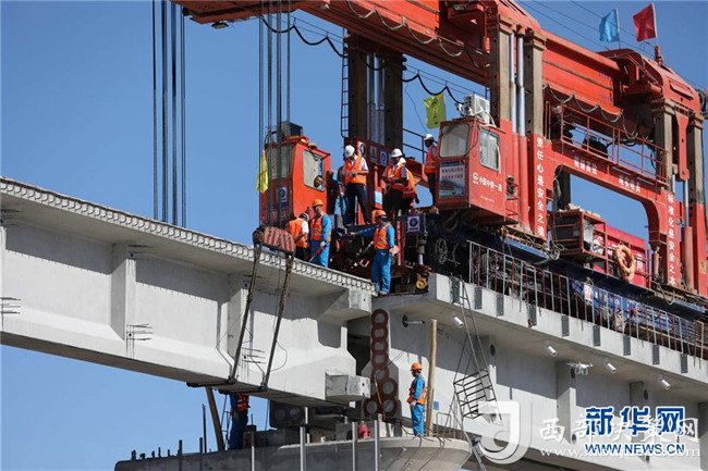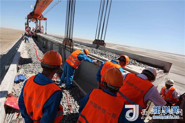 8月17日,施工人員在位于新疆若羌縣的臺特瑪湖特大橋施工現(xiàn)場作業(yè)。8月17日11時58分,在一組架橋機和運梁機的協(xié)調(diào)配合下,隨著最后一孔T型梁上的梁體精準吊裝到位,全長24.558公里、歷時2年建設的格庫鐵路(青海格爾木——新疆庫爾勒)最長鐵路橋——新疆臺特瑪湖特大橋?qū)崿F(xiàn)合龍。新華社發(fā)