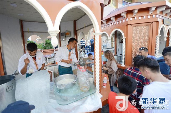 8月18日,在烏魯木齊二道橋大巴扎步行街,商販在制作冷飲。