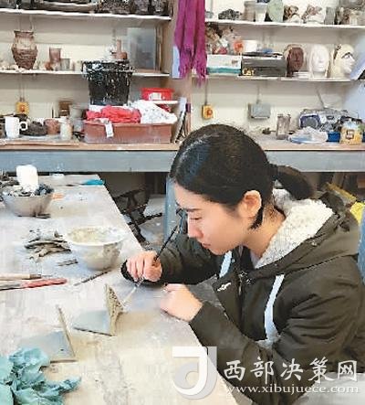 韋啟雯在制作滴水瓦