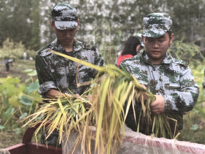 據介紹,川大錦城這一片金燦燦的稻谷于今年4月栽種,經過了幾個月生長,迎來了大豐收,“這是我們自己種的,現(xiàn)在自己來收割,感覺特別有意義。”結束了上午軍訓的大一學生也來到了現(xiàn)場,幫忙打谷子。