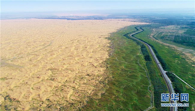 黃河流經(jīng)寧夏中衛(wèi)市騰格里沙漠邊緣(6月26日無人機(jī)拍攝)。 寧夏,地處中國西北腹地。這里的大山、大河、草原、沙漠、湖泊,猶如一幅幅美妙畫卷,讓人流連忘返。 新華社記者 王鵬 攝
