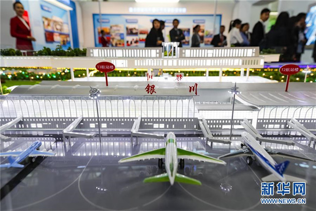 9月19日,觀眾在參觀展覽上展出的銀川河?xùn)|國際機場綜合交通樞紐模型。9月19日,寧夏回族自治區(qū)成立60周年大型成就展在銀川國際會展中心開幕。記者沈伯韓攝