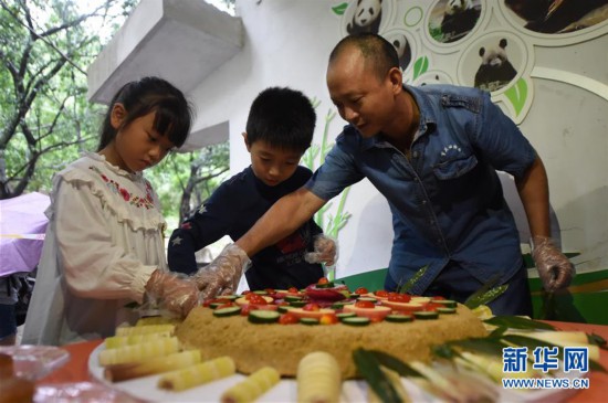 9月24日,在重慶動物園,工作人員與小朋友為大熊貓“新星”手工特制“月餅”。 當日是中秋節(jié),重慶動物園工作人員邀請小朋友與36歲的大熊貓“新星”一同過中秋節(jié)。在工作人員的指導下,小朋友們用水果、蔬菜和麥粑特制一份月餅送給“新星”。 新華社記者唐奕攝