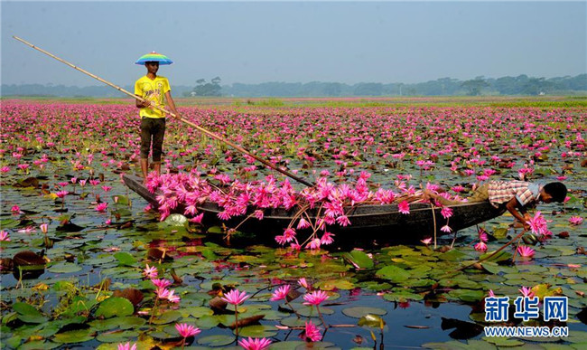 10月7日,在孟加拉國巴里薩爾地區(qū),當?shù)鼐用裨诓烧彙?近日,孟加拉國巴里薩爾地區(qū)的睡蓮進入盛開時節(jié)。 新華社發(fā)(薩利姆·禮薩 攝)