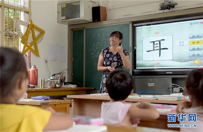 在安徽省黃山市黃山區(qū)烏石鎮(zhèn)清溪中心小學(xué)茶兒垅村教學(xué)點(diǎn)內(nèi),蔣秀蘭老師在給孩子們上語文課(9月7日攝)。今年53歲蔣秀蘭老師從1983年參加工作開始,一直獨(dú)自堅(jiān)守在“一人一校”的單班教學(xué)點(diǎn),最多的時(shí)候獨(dú)自一人帶過26名學(xué)生,目前她負(fù)責(zé)兩個(gè)年級5個(gè)孩子7門課的教學(xué)。  新華社記者 王正忠 攝