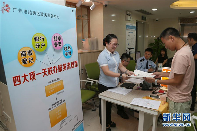 7月19日,“四大項(xiàng)一天聯(lián)辦服務(wù)專窗”在廣州市越秀區(qū)政務(wù)服務(wù)中心亮相,工作人員將營業(yè)執(zhí)照遞交給申請者。 新華社記者 張加揚(yáng) 攝