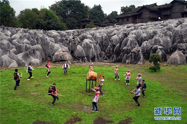 10月14日,工作人員在興文石海世界地質(zhì)公園內(nèi)表演苗族花山節(jié)節(jié)目。