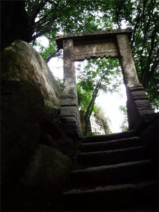 北斗坪上蒼松參天,青竹挺翠,初入有石卷門,稱總天一門。舊時(shí)門前石牌樓有鐵獅一對(duì),分立兩側(cè),獅高數(shù)尺,生動(dòng)逼真,今移至東道院。過(guò)門行數(shù)步,可見(jiàn)兩山環(huán)抱,風(fēng)景宜人,一石坊,額書“紫宸駐蹕”,意為這里是紫微星官居住的地方。