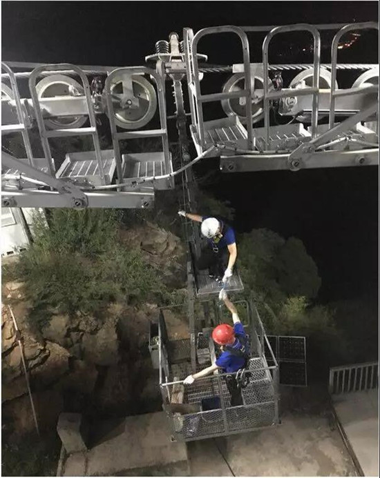 每年的五一和十一是景區(qū)游客最多的時(shí)候,也是索道維護(hù)工最忙的時(shí)候。除了正常巡線外,維護(hù)工還要分出一部分人到每個(gè)支架下面固定值守。有一年送完游客后剛準(zhǔn)備撤離時(shí),山上突然刮起了大風(fēng),索道保護(hù)性停車,值守在支架下的維護(hù)工們就在野外呆了一夜。山上夜晚的風(fēng)特別大,感覺(jué)能把人連帳篷吹到溝里去。那一夜,巨文躲進(jìn)套在支架爬梯外邊的鐵皮護(hù)筒里,蜷縮著熬過(guò)了一個(gè)漫長(zhǎng)的夜晚。