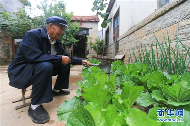 山東沂水縣龍家圈街道寨里社區(qū)居民王培義老人在給家中的院子里蔬菜澆水(10月9日攝)。得益“四權(quán)分置”的制度設(shè)計(jì),今年89歲的貧困戶(hù)王培義已連續(xù)3年收到草莓大棚效益分紅。新華社記者 王南 攝