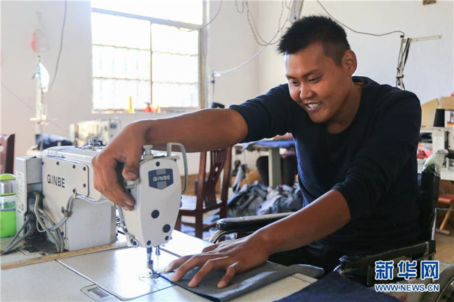 在山東蘭陵縣礦坑鎮(zhèn)朱柳屯村的扶貧車(chē)間,貧困戶(hù)范加誠(chéng)操作縫紉機(jī)加工布料(10月10日攝)。今年29歲的范加誠(chéng)八年前在建筑工地打零工時(shí)被因意外造成高位截癱。2016年,5萬(wàn)元扶貧貸款為范加誠(chéng)扶貧車(chē)間建設(shè)送來(lái)“及時(shí)雨”。一個(gè)月的時(shí)間,他就有了寬敞明亮的加工車(chē)間和8臺(tái)嶄新的縫紉機(jī)。新華社記者 王南 攝