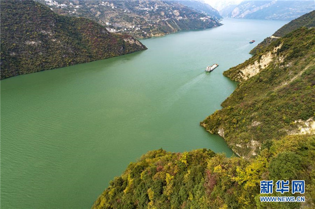 10月30日,船舶在長江西陵峽一帶水域行駛(無人機(jī)拍攝)。 金秋時(shí)節(jié),神州大地層林盡染,美不勝收。 新華社發(fā)(王罡 攝)