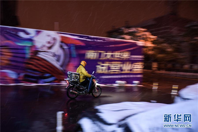 在青海省西寧市,一名外賣(mài)配送員冒雪騎行(11月3日攝)。 11月3日,青海省西寧市等地迎來(lái)降雪。 新華社記者 吳剛 攝