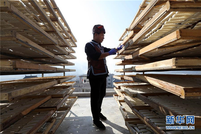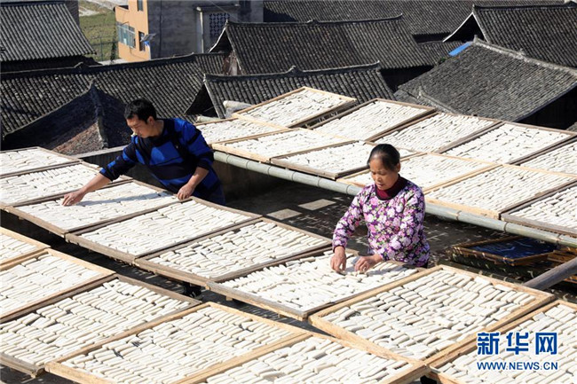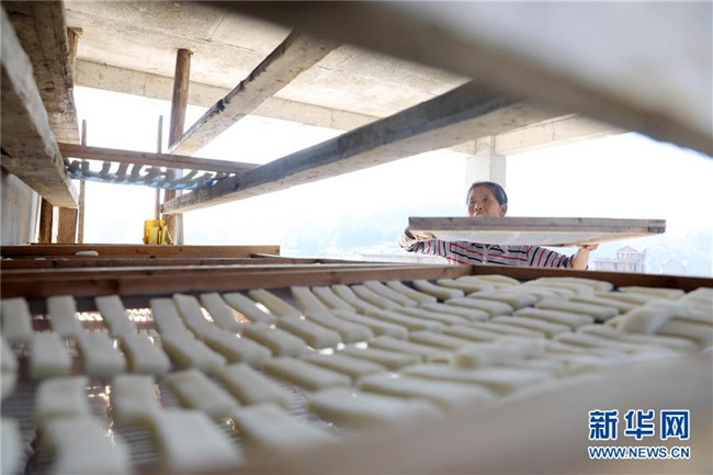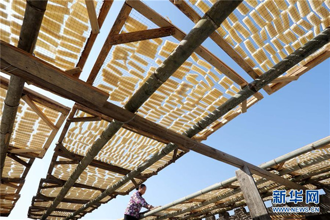 11月4日,在貴州省黎平縣中潮鎮(zhèn)佳所侗寨,村民在晾曬“侗果”粑塊。 近日,貴州省黔東南苗族侗族自治州黎平縣中潮鎮(zhèn)佳所侗寨的村民們搶抓晴好天氣,忙著制作、晾曬“侗果”,侗寨里一派忙碌。“侗果”是當(dāng)?shù)囟弊逋捅貍涞奶厣朗?,是將蒸熟的糯米切成小粑塊后,再經(jīng)曬干、油炸、澆紅糖和上芝麻等工序制作而成。 新華社發(fā)(楊代富 攝