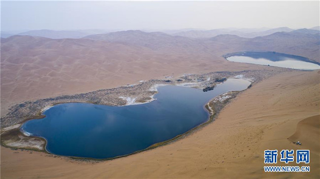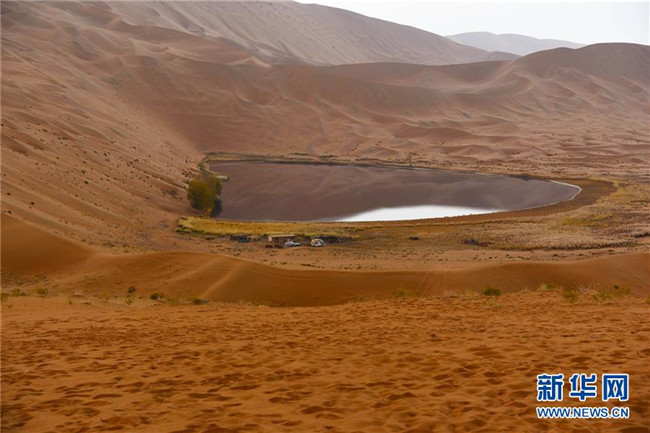 陰雨中的沙漠湖泊,常常讓人以為是一面鏡子(10月18日攝)。 巴丹吉林沙漠位于內(nèi)蒙古西部阿拉善盟,是中國第三大沙漠,沙丘起伏的曲線陡變成高聳的沙山,碧藍的湖泊散落在沙海間。 新華社記者 李仁虎 攝