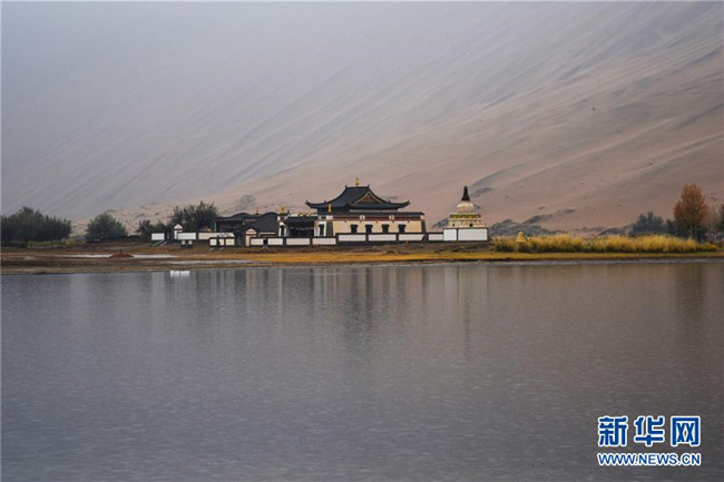 位于沙漠腹地的巴丹吉林廟(10月19日攝)。 巴丹吉林沙漠位于內(nèi)蒙古西部阿拉善盟,是中國第三大沙漠,沙丘起伏的曲線陡變成高聳的沙山,碧藍的湖泊散落在沙海間。 新華社記者 李仁虎 攝