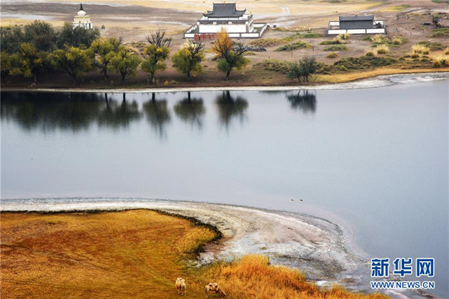 巴丹吉林廟位于名為“廟海子”的湖泊旁(10月19日攝)。 巴丹吉林沙漠位于內(nèi)蒙古西部阿拉善盟,是中國第三大沙漠,沙丘起伏的曲線陡變成高聳的沙山,碧藍的湖泊散落在沙海間。 新華社記者 李仁虎 攝