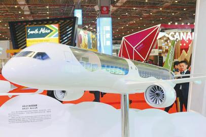 進(jìn)口博覽會上展出的ARJ21支線客機模型。本版攝影 記者 李向雨
