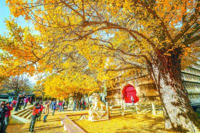 金秋時節(jié),京城各公園和景區(qū)落葉繽紛,美景如畫。昨天,北京石刻藝術博物館內的真覺寺金剛寶座旁,兩株樹齡近600歲的古銀杏樹一片金黃,吸引市民觀賞留影。本報記者 武亦彬攝