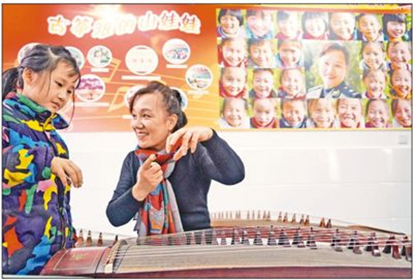 安徽省金寨縣梅山鎮(zhèn)小南京村“山娃娃古箏班”創(chuàng)辦4年來,為三十幾名留守兒童帶來溫暖。創(chuàng)辦人俞曉冬原為南京軍區(qū)前線文工團(tuán)國家一級(jí)古箏演奏家。2014年,她自籌資金20多萬元購置40多架古箏,在小南京學(xué)校建起一間古箏教室,利用音樂課、課余和周末時(shí)間無償對(duì)山村留守兒童進(jìn)行古箏培訓(xùn)和音樂教育。一年中,俞曉冬有150多天都住在學(xué)校,與山娃們朝夕相處,孩子們親切地稱她為“古箏媽媽”。一批批山娃娃在小學(xué)畢業(yè)前通過全國器樂水平十級(jí)考試,還多次參加國內(nèi)公益演出。圖為俞曉冬老師在教留守兒童學(xué)古箏。(趙樹宴/攝)