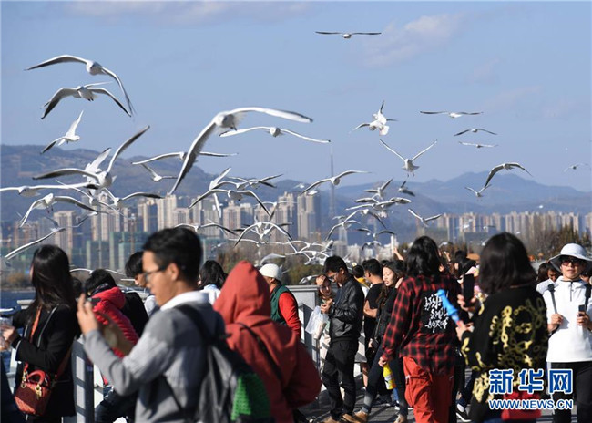 11月19日,游客在昆明滇池海埂大壩給紅嘴鷗喂食。 新華社記者楊宗友攝