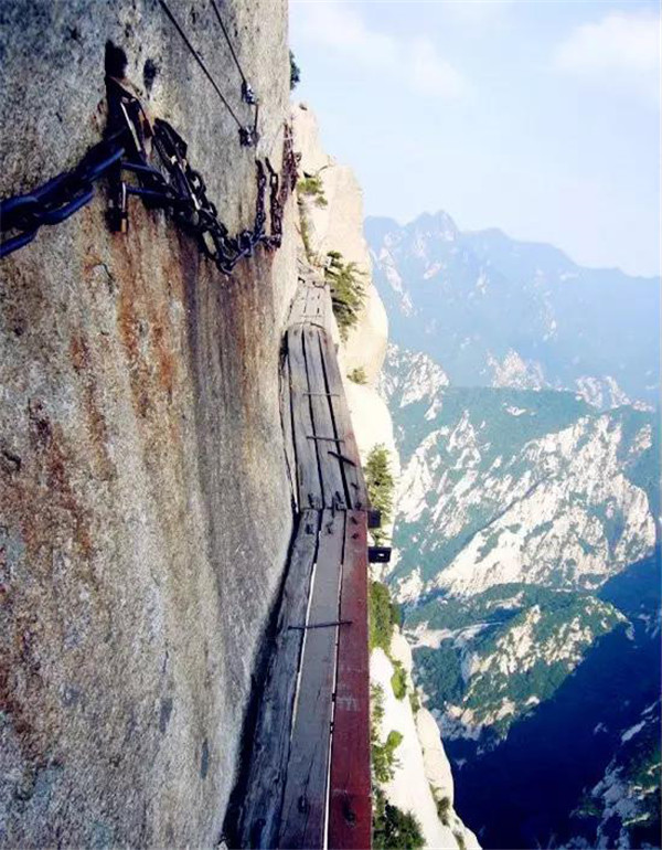 西岳華山歷來被認(rèn)為是五岳之中最為險(xiǎn)峻的,而在華山中,險(xiǎn)中之險(xiǎn)莫過于“長空棧道”和“鷂子翻身”。特別是具有700多年歷史的長空棧道,在華山南峰東側(cè)山腰的萬仞絕壁上鑿出來的幾個(gè)踏腳之處,鑲嵌石釘搭木椽搭建了一個(gè)百余米懸空的棧道,讓人望而卻步,如果你有恐高癥,僅僅看一眼都會讓你驚恐萬分。2013年,著名旅游網(wǎng)站“Smarter Travel”盤點(diǎn)全球最恐怖懸崖步道,將華山長空棧道列為全球十大最恐怖的懸崖步道之一。