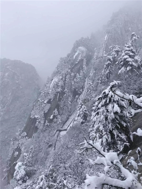 大概到了千尺幢,路就非常陡峭了,幾乎垂直攀登。戴上手套,登山杖收進(jìn)背包,抓緊鐵鏈子,懸崖外寒風(fēng)呼嘯,雨雪交加,絕壁上的古松巍然屹立,驢友相互鼓勵(lì)有說有笑,天冷,但心是熱的。