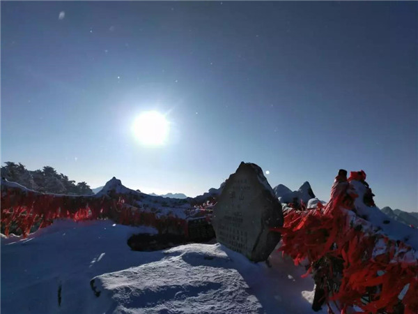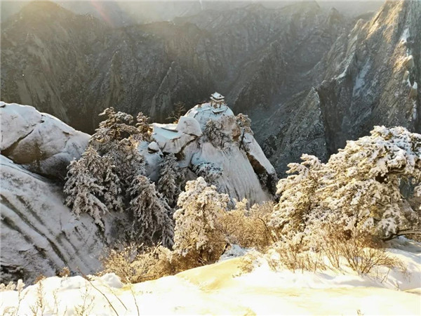 過后,又看到了下棋亭,長(zhǎng)空棧道,華山松,西峰,南峰。想到金庸先生,想到“華山論劍”,“飛雪連天射白鹿,笑書神俠倚碧鴛”,伴隨了中國(guó)幾代人的武俠情懷。這里,金色的陽(yáng)光,湛藍(lán)的天空,皚皚白雪;站在南峰仰天池上,左手秦嶺群山,右手八百里秦川,這就是華山之巔!