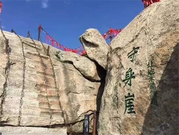 位于華山西峰頂摘星石北。民間傳說古時有個孝子,雙親身染重疾,久治不愈,聽說岳神靈驗,便登山拜神求醫(yī)。在向岳神祈禱的過程中,孝子許愿說只要雙親病愈,愿舍去自己的性命來報答神靈。果然,當孝子返回家中時,父母都已康復,且已下田耕作去了。孝子還愿來到華山,毫不猶豫的從此處跳下深淵,可他卻覺得身體若有人托起,似乘長風,飄飄欲仙。待清醒時,原來依然躺在家中,似夢非夢。孝子知道是華山神暗中相助,便告別父母到華山西峰作了道士。后人被孝子的誠心感動,就將此處命名為舍身崖。 清道光年間李榕的伯祖李仁龍為阻止后人仿效孝子的行為,改舍身崖為省身崖,以警示忤逆之街徒游到這里時應對照孝子,自警自省,痛改前非。后來又有人認為舍身救雙親的行為并不可取,也稱崖作守身崖,以教育后人生命可貴,不可輕擲。