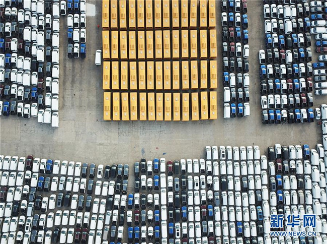 大批國產(chǎn)車輛在江蘇連云港港口碼頭等待裝船(2018年12月31日無人機(jī)拍攝)。 新華社發(fā)(耿玉和 攝)