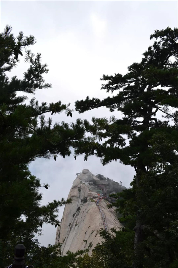 經(jīng)煉丹爐、孝子峰,云霧悄悄退隱,我們向南峰頂挺進(jìn)。南峰蒼翠秀麗,沿途的華山松千姿百態(tài),引人注目。華山迎客松生長(zhǎng)于懸崖峭壁的石縫中,向懸崖一側(cè)伸出虬勁的枝干,就像好客的秦人伸出有力的大手歡迎遠(yuǎn)道而來(lái)的客人。虬枝龍形的枝干上,是綠意盎然的松針,根根好像要刺破天穹。華山迎客松在藍(lán)天白云的映襯下,仿如碧玉雕琢而成,綠的耀眼,秀挺卓然!