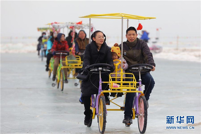 游客在南疆巴音郭楞蒙古自治州境內(nèi)的博斯騰湖冰面上騎自行車(2月6日攝)。各地張燈結(jié)彩,處處歡聲笑語,地處中國西北邊陲的新疆各族群眾,新春佳節(jié)期間,耍社火、逛廟會、看演出、玩冰雪,載歌載舞,在濃濃的中華傳統(tǒng)文化氛圍中熱熱鬧鬧過大年。新華社發(fā)(年磊攝)