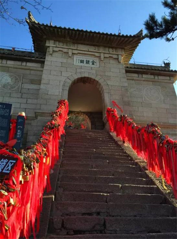 金鎖關——登山路兩側鐵索上情侶鎖,重重疊疊,紅繩彩線迎風搖曳,在這里,鎖住你們對愛情的誓言,表達隊愛情忠貞!
