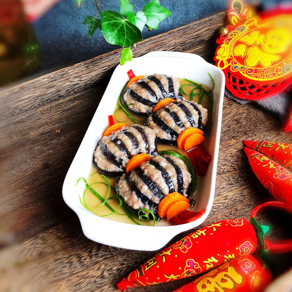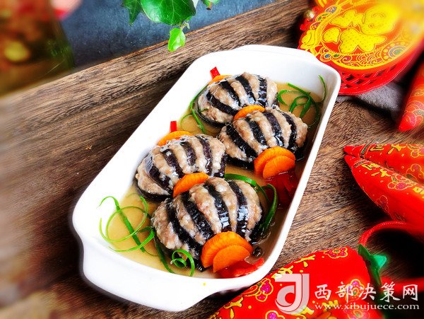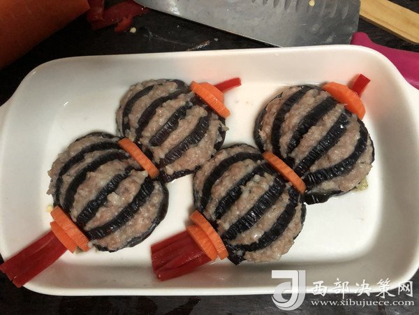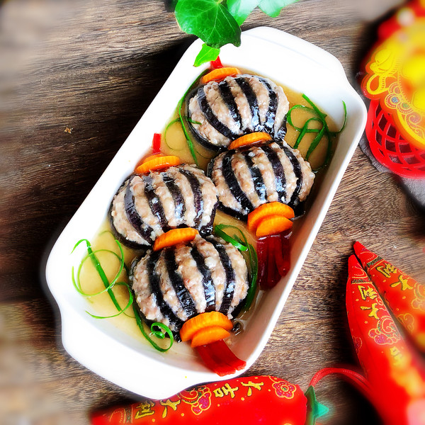 “今天買了一個大茄子,釀入豬肉餡,樣子像極了燈籠,如果你想顏色更深一點(diǎn),那就在調(diào)肉餡的時候加點(diǎn)老抽甚至加點(diǎn)紅曲粉,最后調(diào)澆汁的時候可以調(diào)成酸甜的番茄汁味,那就看起來更加的紅紅火火了。不過我還是比較喜歡這種小清新的風(fēng)格。這道菜一上桌,能把大魚大肉都比下去,好看好吃還喜慶。”